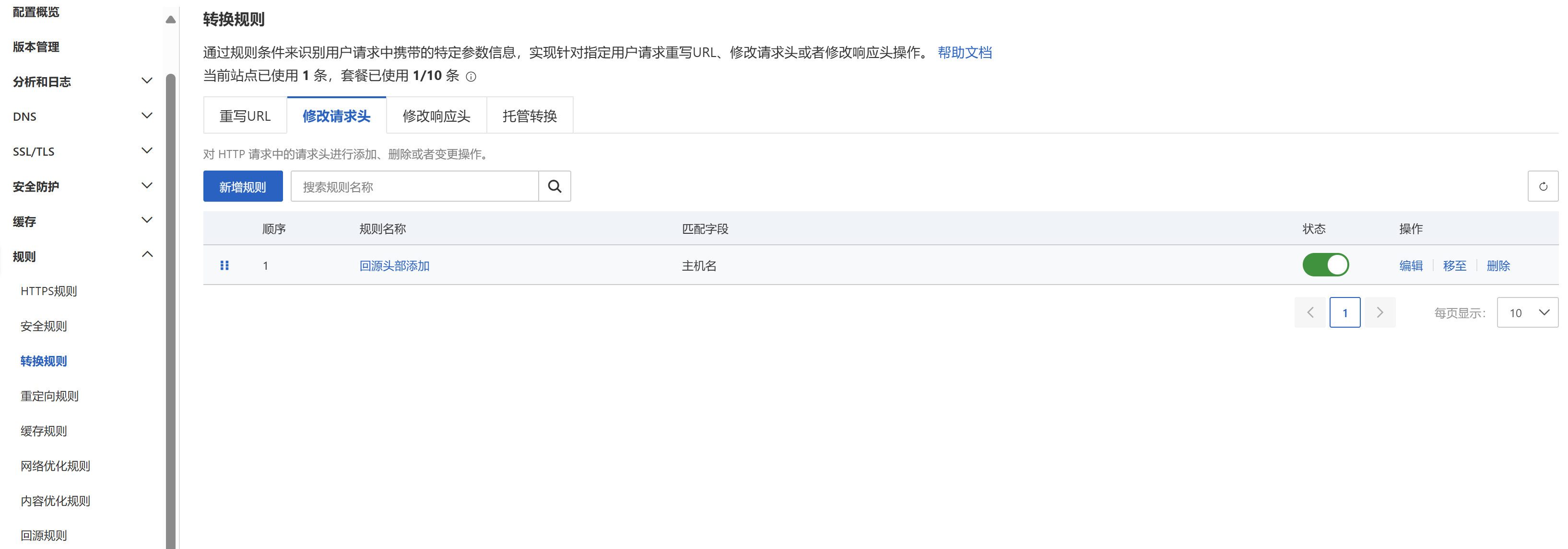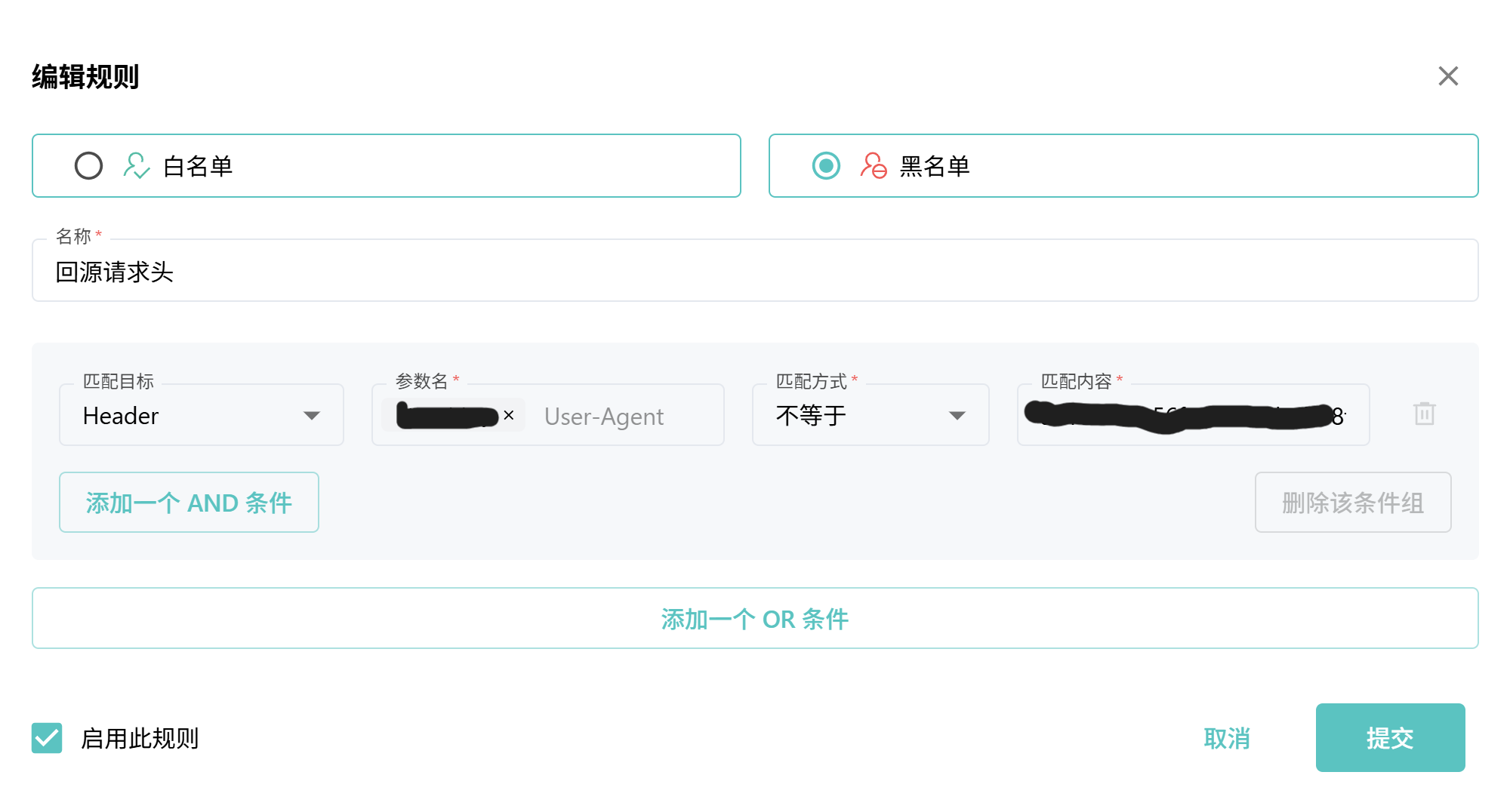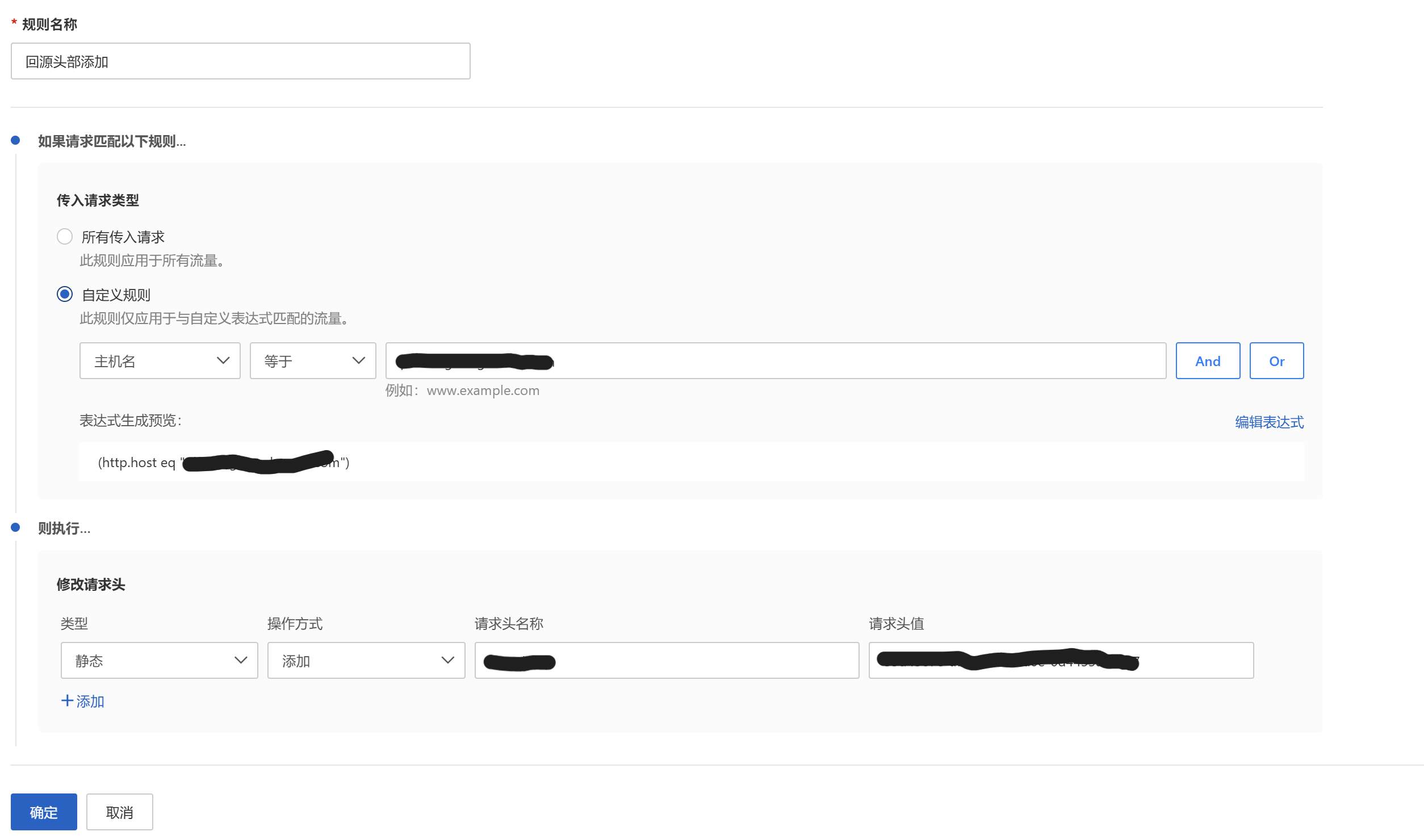 自定义域名可选择等于或包含,请求头名称及请求头值与上方源站配置一致