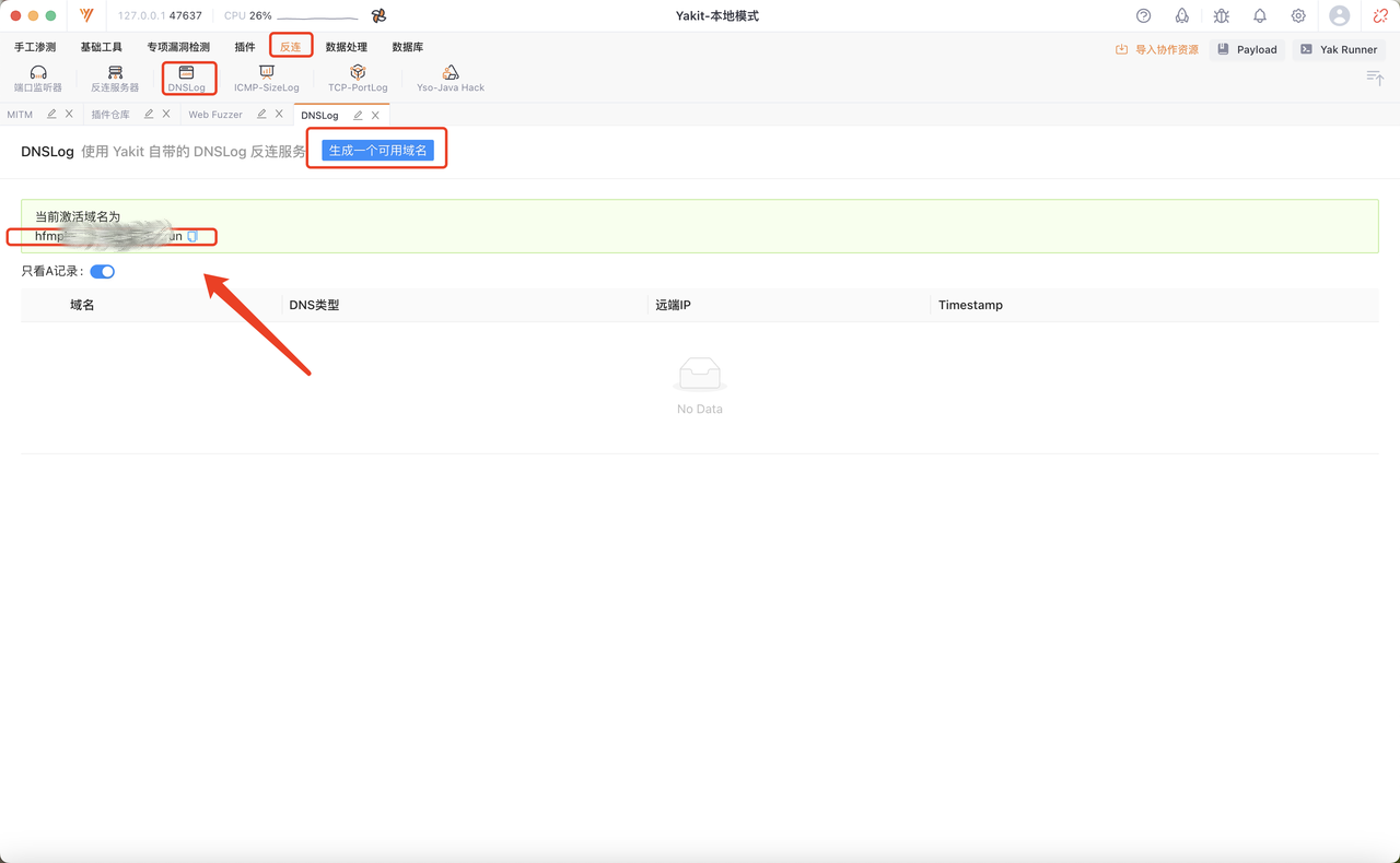 使用DNSlog工具生成一个可用域名,以下使用yakit中DNSlog工具进行测试。
