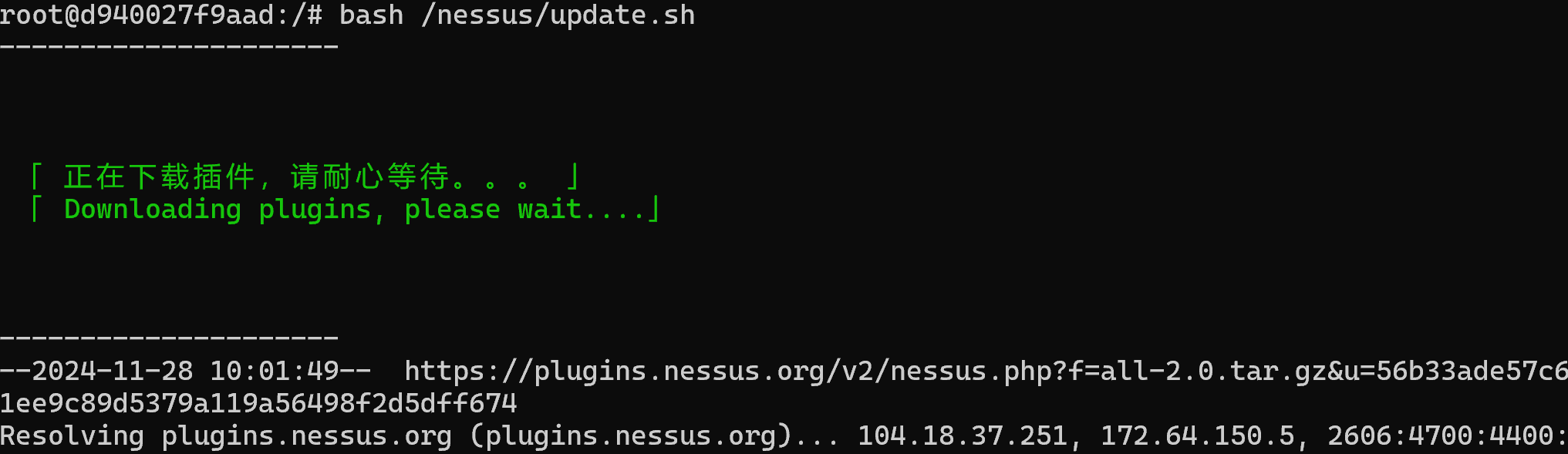 docker exec -it [CONTAINER ID] bash bash /nessus/update.sh