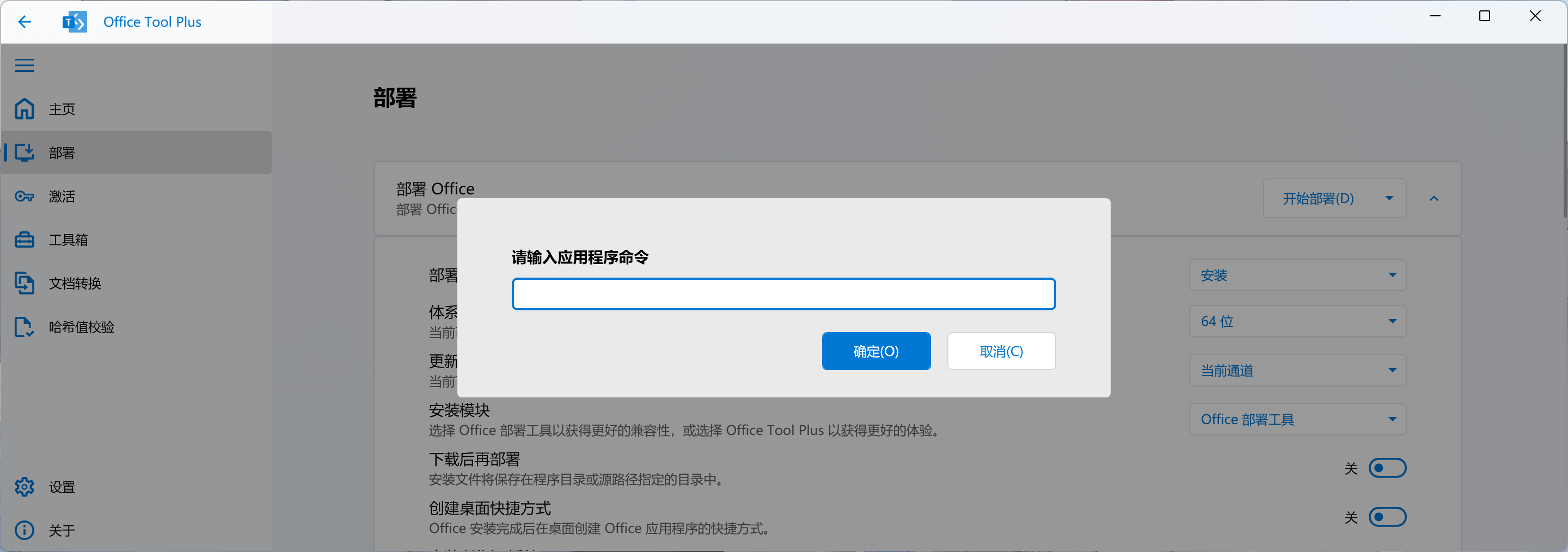 确保自己使用的是最新版的 Office Tool Plus,按下快捷键 Ctrl + Shift + P,打开命令框,按需复制下面的命令,粘贴后回车 Enter 以执行操作。